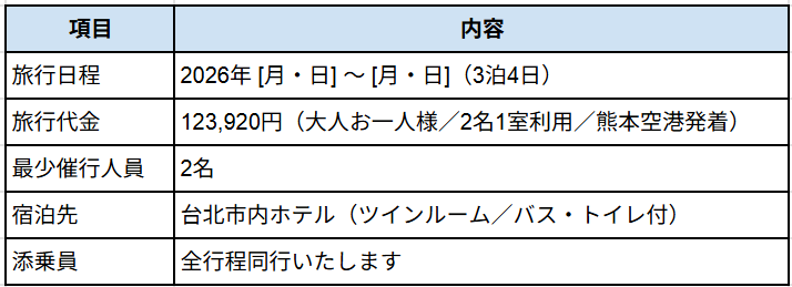 2、安心のサポート: 天草総研のメンバーが同行。初めての台湾でも安心して楽しめます。